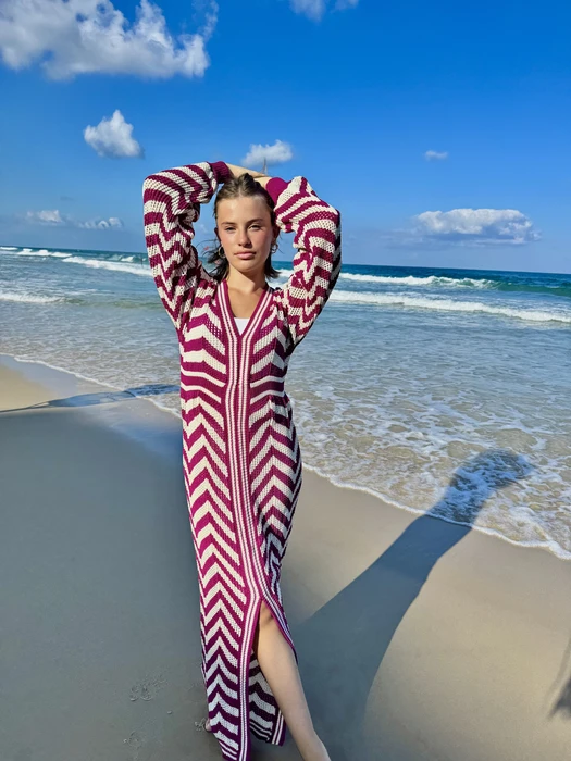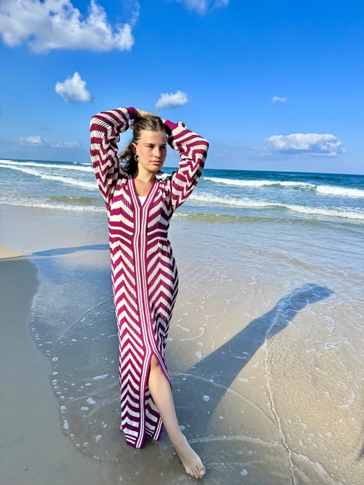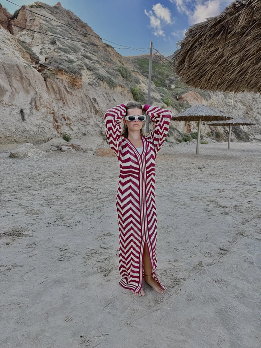 שמלת חוף מהממת בסריגת פסים בורדו-לבן,