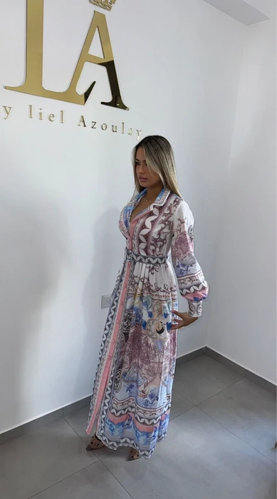 השמלה מעוצבת בגזרה מקסי נשפכת, עם כפתורים לכל אורכה,