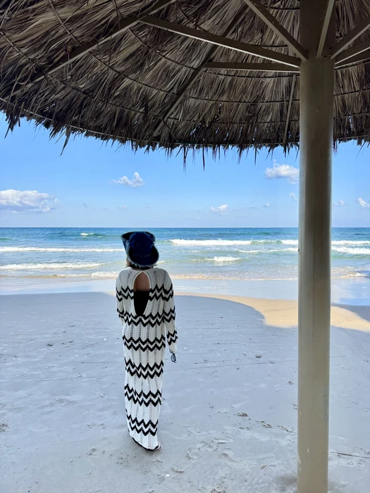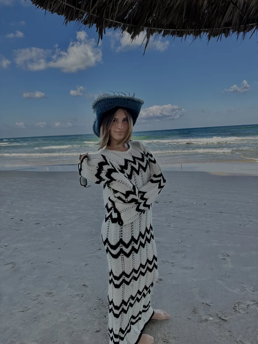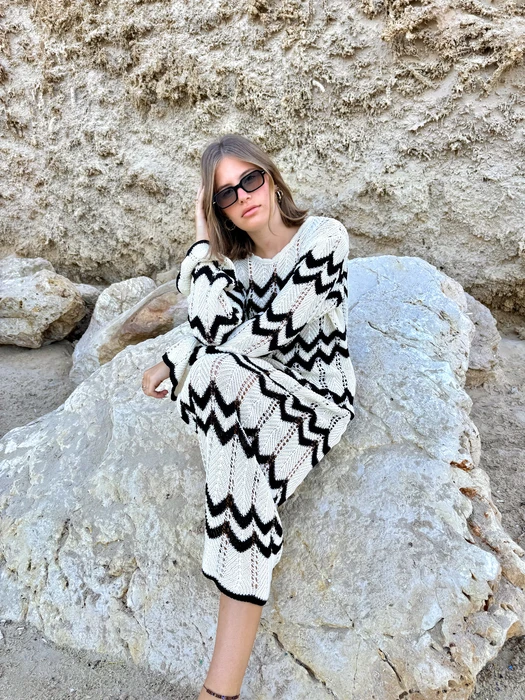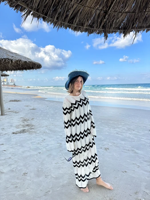 שמלת חוף סרוגה בפסי שחור-לבן שתהפוך כל רגע בקיץ לסטייל מהלך.